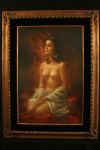 Original oil painting on masonite in its original, heavily detailed frame. Larry Vincent Garrison (who is recently deceased), was best known as "Vincent" and was heavily influenced by the artist Julian Ritter. Dimensions of the image area are 24" X 36". Condition... a bit of unobtrusive scuffing, minor craquelure, and a surface abrasion on her right knee, but nothing that detracts.